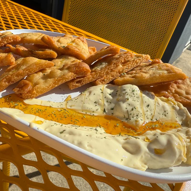 Creamy brie, honey, fried pita